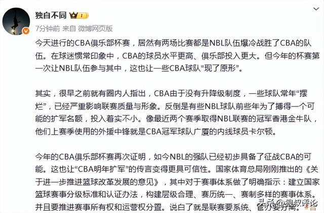 青岛跟队记者杜金城发文点评:“今天进行的CBA俱乐部杯赛,居然有两场比赛都是NBL队伍爆冷战胜了CBA的队伍。在球迷惯常印象中,CBA的球员水平更高、俱乐部投入更大。但今年的杯赛第一次让NBL队伍参与其中,这也让一些CBA球队“现了原形”。